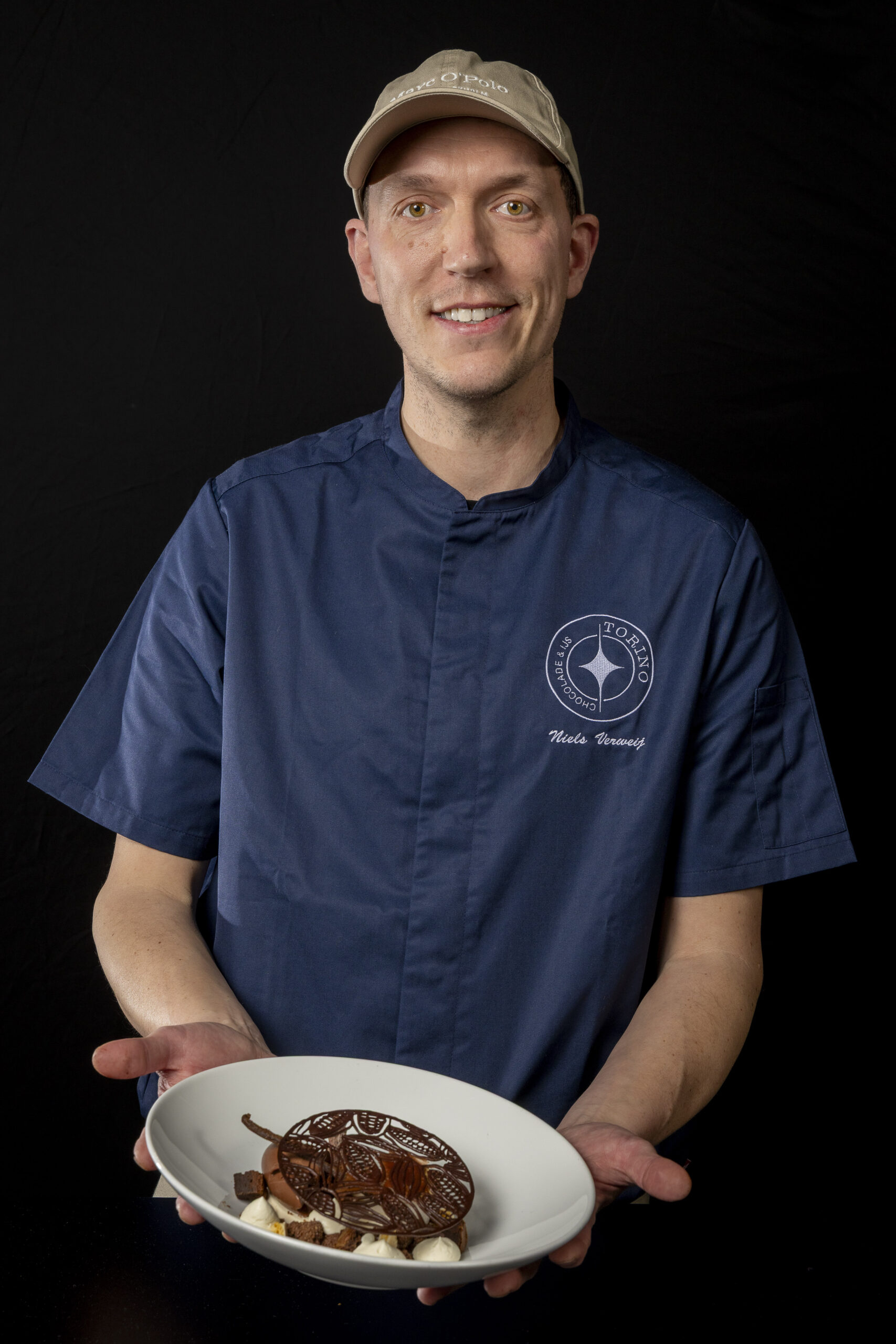 De chocoladesorbet van pure Maracaibo chocolade is natuurlijk het hoofdcomponent en wordt ondersteund door verschillende maaksels van het vruchtensap van de cacaoboon. Hiervan heeft Niels ook een sorbet gemaakt, evenals een lichtzure saus en een knapperige comb. De zachtheid van witte chocolade brengt balans in de vorm van een witte chocolade-koffieparfait en een decoratie, en de verbindende witte chocoladeroom met vanille en tonka.