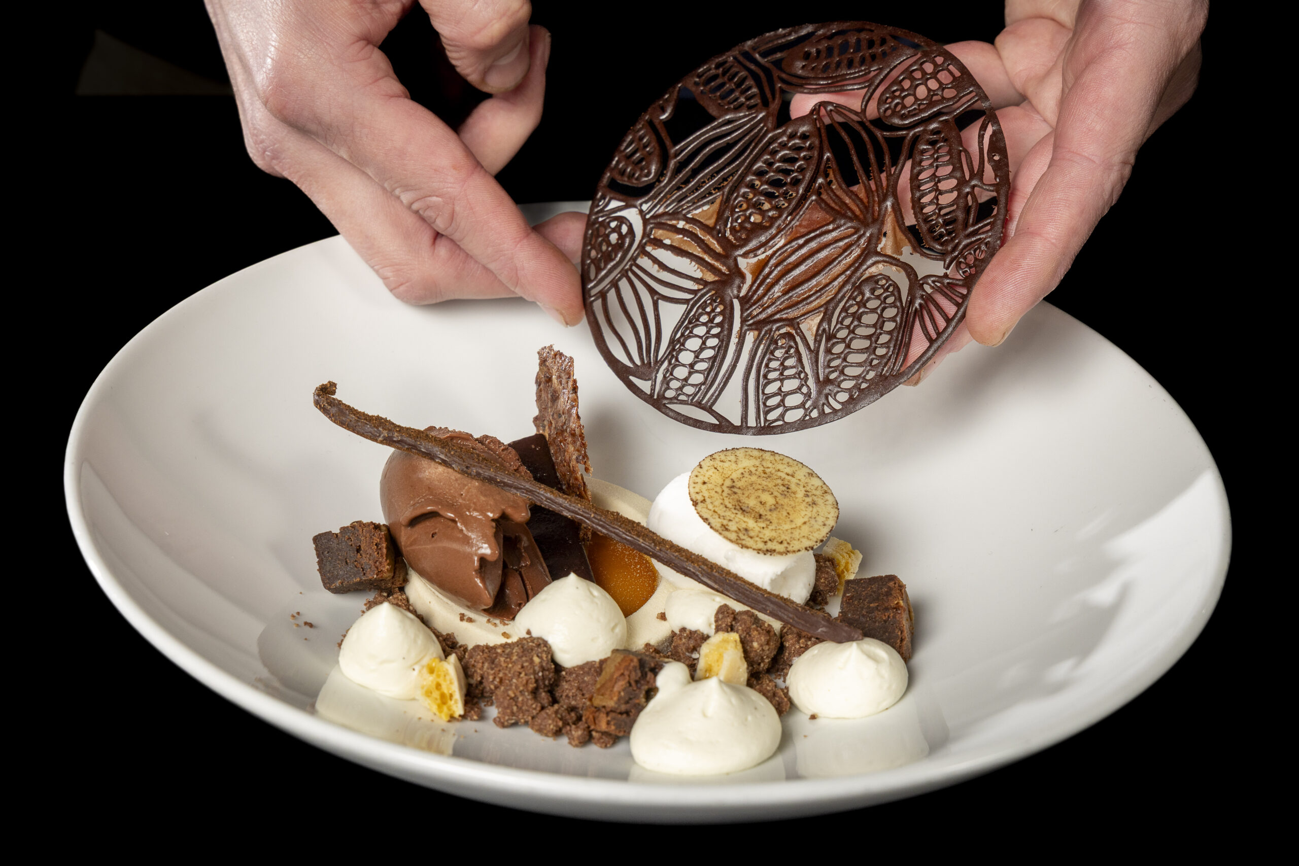 Cacao in vaste vorm mag natuurlijk niet ontbreken: je proeft een zachte brownie, vergezeld met een knapperige cacaotuille en -crumble, chocolade in de vorm van een vanillestokje met tot poeder gemalen vanillestokjes en een nougatine van cacaokernen. Tot slot wil het oog ook wat en daarom is dit prachtige dessert toegedekt met een chocoladetuille met een dessin van cacaovruchten.